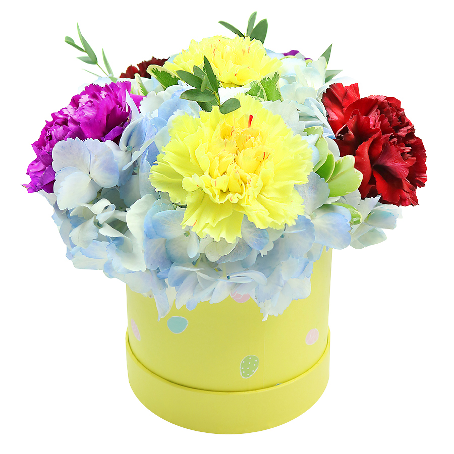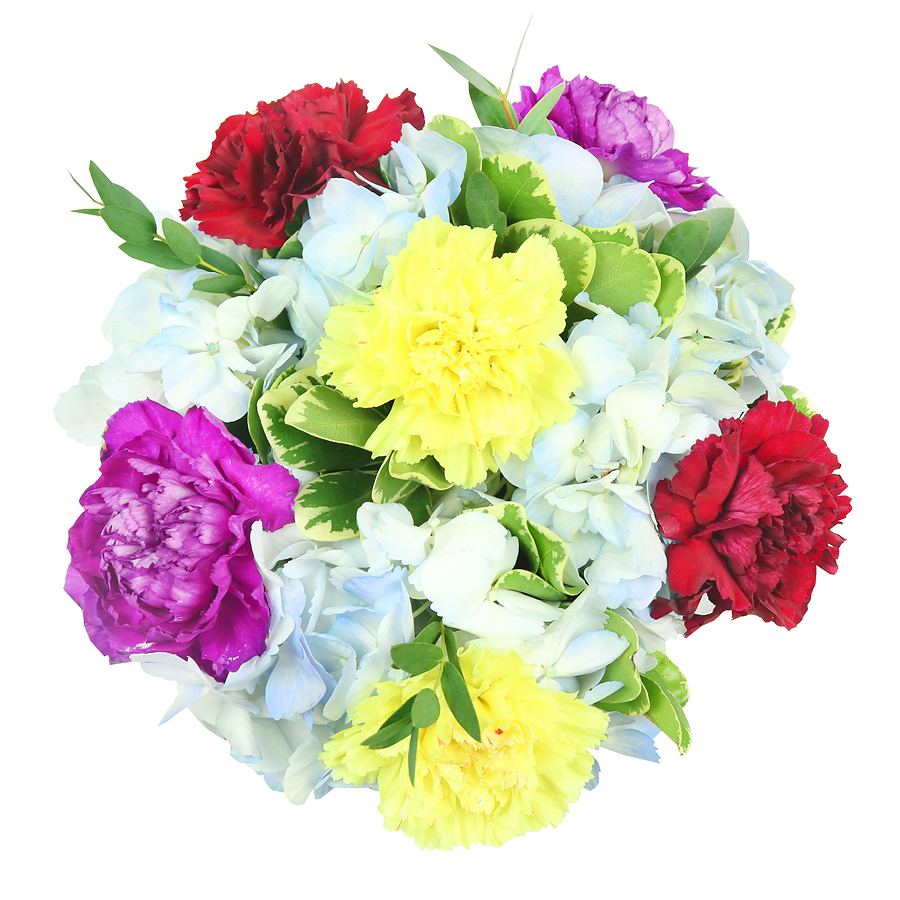 Infuse your moments with the sunlit harmony of our Sunlit Harmony Bouquet, showcasing a radiant mix of red, purple, and yellow carnations complemented by blue hydrangeas and fresh greenery. Each flower is hand-selected to ensure exceptional freshness and quality.