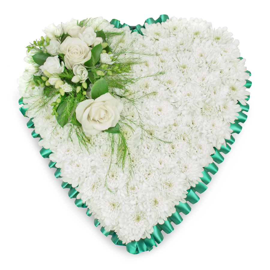 White chrysanthemums are beautifully complemented with white roses and freesia to create this elegant heart. A lovely way to express your deepest sympathy in times of sorrow.