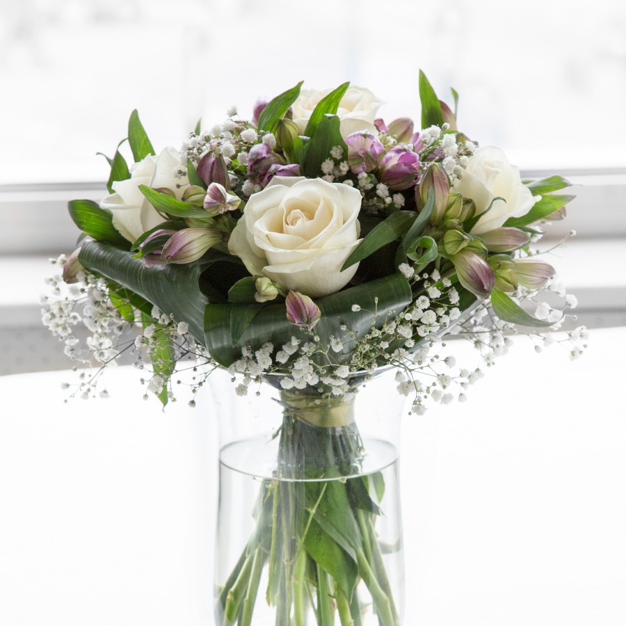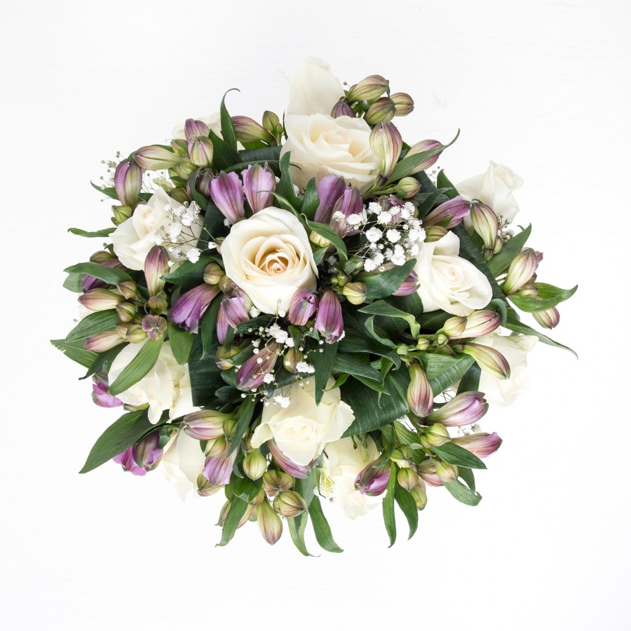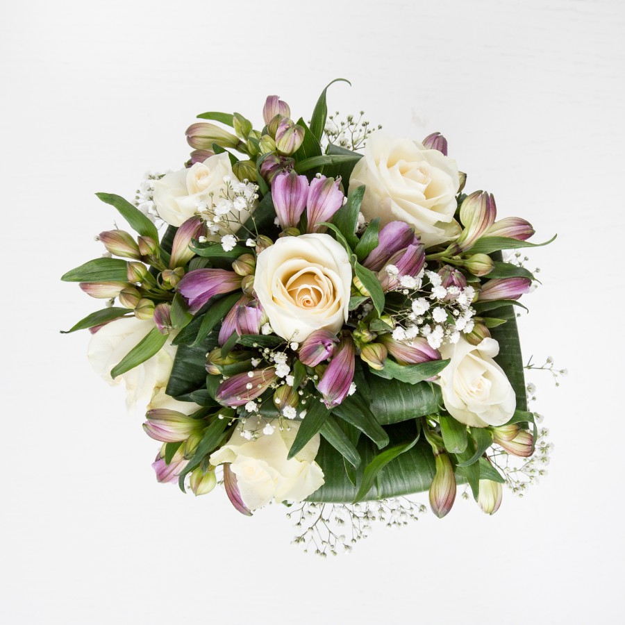 Purity and simplicity is the best description for this hand-tied. Cream ivory roses and royal purple alstroemeria, accompanied with white gypsophila and aspidistra leaves will make your loved one feel very special.